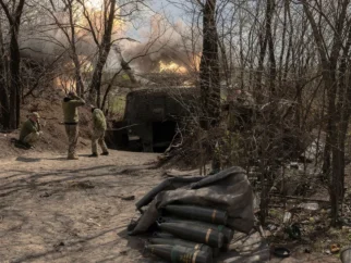 Украинские военнослужащие ведут огонь из гаубицы М109 по российским позициям в неустановленном районе на востоке…