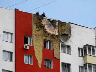 Поврежденный многоквартирный дом во вторник после атаки беспилотника в Московской области. Штурм вынудил четыре международных…