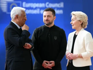 Президент Украины Владимир Зеленский (в центре) выходит на саммит в четверг в Брюсселе вместе с…