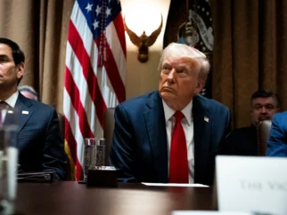 Президент Трамп сидит рядом с госсекретарем Марко Рубио во время заседания кабинета министров в среду.…