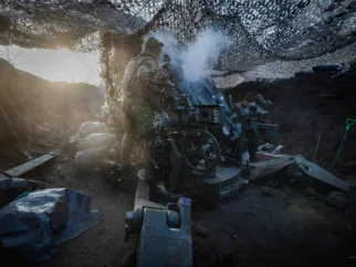 Военнослужащий 38-й отдельной бригады морской пехоты Украины ведет огонь по российским позициям под Покровском, Украина,…